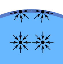 There is also a tension parallel to the surface at the liquid-air interface which will resist an external force, due to the cohesive nature of water molecules.[1][2]