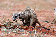 A meerkat has the ability to dig through a quantity of sand equal to its own weight in just seconds.[20] Digging is done to create burrows, to get food and also to create dust clouds to distract predators.[21]