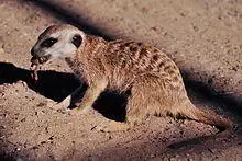 The meerkat or suricate (Suricata suricatta) is a small carnivoran belonging to the mongoose family (Herpestidae). It is the only member of the genus Suricata.[2] Meerkats live in all parts of the Kalahari Desert in Botswana, in much of the Namib Desert in Namibia and southwestern Angola, and in South Africa. A group of meerkats is called a "mob", "gang" or "clan". A meerkat clan often contains about 20 meerkats, but some super-families have 50 or more members. In captivity, meerkats have an average life span of 12–14 years, and about half this in the wild.