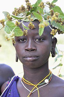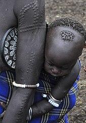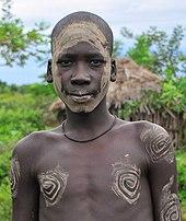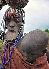At a young age, to beautify themselves for marriage, most women have their bottom teeth removed and their bottom lips pierced, then stretched, so as to allow insertion of a clay lip plate. This has become the hallmark of the Suri - as for the Mursi - and the main reason they have been sought out by tourists interested in the 'exotic'. Some women have stretched their lips so as to allow plates up to sixteen inches in diameter.[7] Increasing with exposure to other cultures, however, a growing number of girls now refrain from this practice. Their children are sometimes painted with (protective) white clay paint, which may be dotted on the face or body.[8][6]