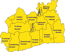The Anglo-Saxon period saw the emergence of the shire's internal division into 14 hundreds, which continued until Victorian times. These were the hundreds of Blackheath, Brixton, Copthorne, Effingham Half-Hundred, Elmbridge, Farnham, Godalming, Godley, Kingston, Reigate, Tandridge, Wallington, Woking and Wotton.