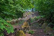 Few traces of the ancient British and Roman periods survive in Surrey. There are a number of round barrows and bell barrows in various locations, mostly dating to the Bronze Age. Remains of Iron Age hillforts exist at Holmbury Hill, Hascombe Hill, Anstiebury (near Capel), Dry Hill (near Lingfield), St Ann's Hill (Chertsey) and St George's Hill (Weybridge).[62] Most of these sites were created in the 1st century BC and many were re-occupied during the middle of the 1st century AD.[63] Only fragments of Stane Street and Ermine Street, the Roman roads which crossed the county, remain.