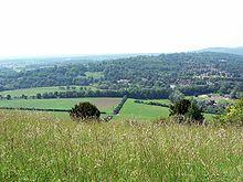 To the south of the Downs in the western part of the county are the sandstone Surrey Hills, while further east is the plain of the Low Weald, rising in the extreme southeast to the edge of the hills of the High Weald.[3] The Downs and the area to the south form part of a concentric pattern of geological deposits which also extends across southern Kent and most of Sussex, predominantly composed of Wealden Clay, Lower Greensand and the chalk of the Downs.[3]