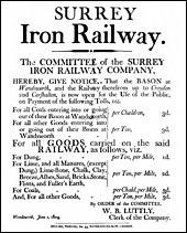 The Surrey Iron Railway (SIR) was a horse-drawn plateway that linked Wandsworth and Croydon via Mitcham, all then in Surrey but now suburbs of south London, in England. It was established by Act of Parliament in 1801, and opened partly in 1802 and partly in 1803.[1] It was a toll railway on which carriers used horse traction. The chief goods transported were coal, building materials, lime, manure, corn and seeds. The first 8 1&fras1;4 miles (13.3 km) to Croydon opened on 26 July 1803, with a branch line off from Mitcham to Hackbridge.