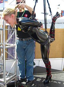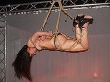 This bondage demonstration during Folsom Street Fair 2005 is a shibari style partial suspension.