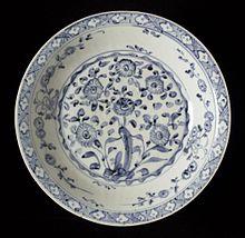 A division of the blue and white wares into three "families" or broad groups has been proposed by Barbara Harrisson: "conservative", "persistent" and "versatile", in chronological order.[20] This classification was further refined by Monique Crick in 2010 into three types of decoration: "Sketchy", "Composed", and "Full "rim-to-rim"".[21] The "Sketchy decoration" group uses "a vigorous, brushed style, painted freehand and spontaneously" by a single artisan.[22] The later groups often use drawing in dark concentrated blue to create the design, which is then overpainted with a lighter wash, in the same style that is often used with black and turquoise in the polychome enamels. Some of these pieces have visible pin pricks indicating where a stencil was fixed, presumably allowing rapid painting of the wash. The outline would have needed to dry before the wash was applied, suggesting that a number of artisans were involved in different stages of production requiring different levels of skill.[23]