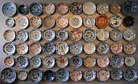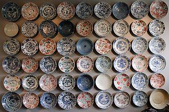 A relatively rare type is decorated in both underglaze blue and white and overglaze enamels. These pieces were expensive to produce and seem to have been made for the Japanese market.[28] An example can be seen in the wall of dishes illustrated (D5).