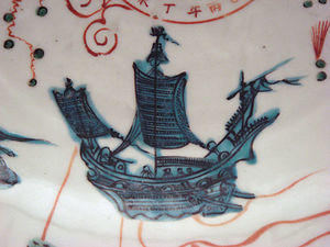 The most common subjects are birds in flight or at rest in or by water, and flowers. Animals, especially deer, set in a landscape are also common, as main subjects or in medallions in the border. Human figures are usually shown as staffage in landscapes, especially manning boats, but sometimes as a main subject. Other motifs are sea-monsters and dragons, both oddly-shaped. Some dishes have Islamic inscriptions in Arabic, intended for South East Asian Muslims rather than those further west. Some dishes show European ships, and represent Western ship's compasses. The designs show awareness of contemporary Jingdezhen porcelain, but at a considerable distance. Smaller numbers of pieces, often undecorated, are in a range of other background colours, especially blues and browns, usually achieved by slips, but also by applying coloured glazes all over.[12]
