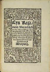 The last major outbreak of the disease occurred in England in 1551.[33] Though burial patterns in smaller towns in Europe suggest that the disease may have been present elsewhere first,[5] the outbreak is recorded to have begun in Shrewsbury in April.[29] It killed roughly 1,000 there, spreading quickly throughout the rest of England.[34] It had all but ceased by October.[34] It was more prevalent among younger men than in other groups, though this may have been due to greater social exposure of younger men.[34] In response to the disease, John Caius wrote A Boke or Counseill Against the Disease Commonly Called the Sweate, or Sweatyng Sicknesse as an eyewitness account. Henry Machin also recorded it in his diary: