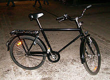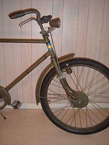 - m/30 - This bicycle was very similar to the later issued m/42, except the pump was frame-mounted, the tools were stored in a frame-mounted leather bag, the carrier was the same sans the tool box, and although equipped with a front drum brake hub, there was no provision to use it. On the civilian model, the front drum brake was actuated by a brake cable connected to a brake handle. It differed noticeably from the German m/30, a spoon brake-equipped, balloon-tired roadster, though often mistaken for it. The Swedish m/30 was built according to specs established by an agreement with several large Swedish manufacturers regarding the interchangeability of parts, with most being assembled by Nymans (Hermes). Wheel size was 26 × 1½ inch (584 mm) and was equipped with a rear coaster-brake hub. Weight: ca. 23.5 kg (52 lb.)[1]