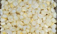 Sweet corn (Zea mays convar. saccharata var. rugosa;[1] also called sweetcorn, sugar corn and pole corn) is a variety of maize with a high sugar content. Sweet corn is the result of a naturally occurring recessive mutation in the genes which control conversion of sugar to starch inside the endosperm of the corn kernel. Unlike field corn varieties, which are harvested when the kernels are dry and mature (dent stage), sweet corn is picked when immature (milk stage) and prepared and eaten as a vegetable, rather than a grain. Since the process of maturation involves converting sugar to starch, sweet corn stores poorly and must be eaten fresh, canned, or frozen, before the kernels become tough and starchy.