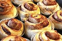 A sweet roll or sweet bun refers to any of a number of sweet, baked, yeast-leavened breakfast or dessert foods. They may contain spices, nuts, candied fruits, etc., and are often glazed or topped with icing.[1] Compared to regular bread dough, sweet roll dough generally has higher levels of sugar, fat, eggs, and yeast.[2] They are often round,[3] and are small enough to comprise a single serving.[4] These differ from pastries, which are made from a paste-like batter;[5] from cakes, which are typically unleavened or chemically leavened;[6] and from doughnuts, which are deep fried.[7]