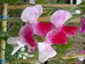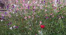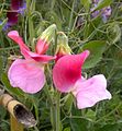 Sweet peas have been cultivated since the 17th century and a vast number of cultivars are commercially available. They are grown for their flower colour (usually in pastel shades of blue, pink, purple and white, including bi-colours), and for their intense unique fragrance. They are grown by gardeners for private enjoyment or for exhibition, and in the floristry trade. The large, pea-shaped seeds are sown in cold frames in Spring or Autumn. The seeds benefit from pre-soaking or chipping with a sharp blade. The plants are also available later in the season, as young plants or plugs. They are grown up canes, with the new shoots being regularly pinched out to promote a bushy habit and higher flower yields. Plants typically reach heights of 1-2m, with the flowers appearing in midsummer and continuing for many weeks if regularly deadheaded.[4]