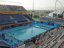 Swimming events at the 2004 Summer Olympics were held at the Athens Olympic Aquatic Centre, officially known as the Olympic Aquatic Centre of the Athens Olympic Sports Complex (OCO) during the games.[6] Originally built for the 1991 Mediterranean Games,[7] it was refurbished to host swimming, diving, synchronised swimming, and water polo events; it was the first time in the history of the Olympics that all aquatics disciplines had been held at a single venue.[6][8] Swimming events were held at the main outdoor pool of the complex, which held 10,893 spectators, and was interchangeably used for swimming and water polo events throughout the duration of the games.[8] A plastic-coated tarpaulin roof covering the two outdoor pools of the complex, designed to protect spectators and swimmers from being exposed to the summer heat, was originally planned to be built as part of the renovations.[7][8] However, due to cost overruns and delays in construction, planners decided to scrap the roof in March 2004,[9][10] which was criticised by FINA, the governing body of water sports.[7][8] The venue would ultimately be approved by FINA weeks before the opening of the games in August.[7]
