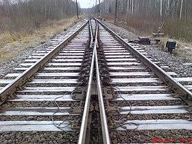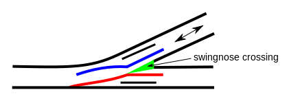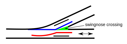 A variety of swingnose crossing, suitable for locations where a branch line turns off a higher-speed line, is the swing wing crossing. In this device, the V-crossing does not need its own motor but is moved by the flange of an approaching wheel on the branch track. It returns to its normal position when the diverging train has passed, pushed by a damped spring.[1]
