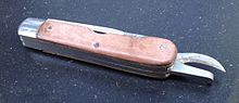 In 1891, Karl Elsener, then owner of a company that made surgical equipment, set out to manufacture the knives in Switzerland itself. At the end of 1891 Elsener began production of the Modell 1890 knives, in direct competition with the Solingen company. He incurred financial losses doing so, as Wester & Co was able to produce the knives at a lower cost. Elsener was on the verge of bankruptcy when, in 1896, he developed an improved knife, intended for the use by officers, with tools attached on both sides of the handle using a special spring mechanism, allowing him to use the same spring to hold them in place.[4] This new knife was patented on 12 June 1897, with a second, smaller cutting blade, a corkscrew, and wood fibre grips, under the name of Schweizer Offiziers- und Sportmesser ("Swiss officer's and sports knife"). While the Swiss military did not commission the knife, it was successfully marketed internationally, restoring Elsener's company to prosperity.[5]