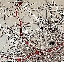 Before the line was constructed, the M&StJWR received authorisation in 1865 to continue the line northwards from Finchley Road to a station at Hampstead. This appeared on some maps.[8] The scheme was cancelled in 1870.[9] A 156-yard (143 m) section of tunnel was built north of Swiss Cottage station for the Hampstead extension, most of which was used for the later extension to the north-west.[10] A short length towards Hampstead was unused.[9] This is still visible today when travelling on a southbound Metropolitan line service.