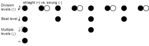 The term swing, as well as swung note(s) and swung rhythm,[b] is also used more specifically to refer to a technique (most commonly associated with jazz[1] but also used in other genres) that involves alternately lengthening and shortening the first and second consecutive notes in the two part pulse-divisions in a beat.