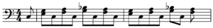 The instruments of a swing rhythm section express swing in different ways from each other, and the devices evolved as the music developed. During the early development of swing music, the bass was often played with lead-in—main-note couplets, often with a percussive sound. Later, the lead-in note was dropped but incorporated into the physical rhythm of the bass player to help keep the beat "solid." Similarly, the rhythm guitar was played with the lead-in beat in the player's physical rhythm but inaudible. The piano was played with a variety of devices for swing. Chord patterns played in the rhythm of a dotted-eight—sixteenth couplet were characteristic of boogie-woogie playing (sometimes also used in boogie-woogie horn section playing). The "swing bass" left hand, used by James P. Johnson, Fats Waller, and Earl Hines, used a bass note on the first and third beats, followed by a mid-range chord to emphasize the second and fourth beats. The lead-in beats were not audible, but expressed in the motion of the left arm. Swing bass piano also put the first and third beats a role anticipatory to the emphasized second and fourth beats in two-beat figures.[14] As swing music developed, the role of the piano in the ensemble changed to emphasize accents and fills; these were often played on the lead-in to the main beat, adding a punch to the rhythm. Count Basie's style was sparse, played as accompaniment to the horn sections and soloists.[15] The bass and snare drums started the swing era as the main timekeepers, with the snare usually used for either lead-ins or emphasis on the second and fourth beats. It was soon found that the high-hat cymbal could add a new dimension to the swing expressed by the drum kit when played in a two-beat "ti-tshhh-SH" figure, with the "ti" the lead-in to the "tshhh" on the first and third beats, and the "SH" the emphasized second and fourth beats. With that high-hat figure, the drummer expressed three elements of swing: the lead-in with the "ti," the continuity of the rhythmic pulse between the beats with the "tshhh," and the emphasis on the second and fourth beats with the "SH". Early examples of that high-hat figure were recorded by the drummer Chick Webb. Jo Jones carried the high-hat style a step further, with a more continuous-sounding "t'shahhh-uhh" two beat figure while reserving the bass and snare drums for accents. The changed role of the drum kit away from the heavier style of the earlier drumming placed more emphasis on the role of the bass in holding the rhythm.[15]