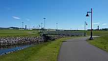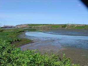Located on the eastern shore of Sydney Harbour in the former city of Sydney (now amalgamated into the Cape Breton Regional Municipality), the Tar Ponds formed in a tidal estuary at the mouth of Muggah Creek, a freshwater stream that empties into the harbour. Throughout the 19th century, runoff from coke ovens associated with Sydney Steel Corporation's (SYSCO) now-decommissioned steel mill filled the estuary with the typical variety of coal-based contaminants and sludge.[2] Efforts to clean up the waterway were dogged by false starts, delays, and political controversy.[3] The coke ovens closed down but 12 years later, the toxic mess remained.[4] After extensive public consultation and technical studies, a C$400 million cleanup plan, jointly funded by the Government of Canada and Government of Nova Scotia, was announced in January 2007.[5] The cleanup was completed in 2013 with the opening of Open Hearth Park which is situated on the site of the former steel plant.[6]