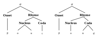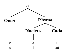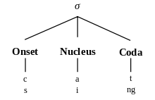 The syllable is usually considered right-branching, i.e. nucleus and coda are grouped together as a "rime" and are only distinguished at the second level.