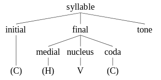 In Chinese syllable structure, the onset is replaced with an initial, and a semivowel or liquid forms another segment, called the medial. These four segments are grouped into two slightly different components: