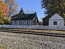 Throughout the 1830s and 1840s, rail transportation saw significant expansion throughout the Great Lakes region. In 1833, the Erie and Kalamazoo Railroad was chartered as part of the Lake Shore and Michigan Southern Railway, running from former Port Lawrence, Michigan (now Toledo, Ohio), to the mouth of the Kalamazoo River at Lake Michigan.[15] Trains were at first pulled by horse until the first steam locomotive was installed in 1837. Sylvania built its own railroad depot along the Erie-Kalamazoo Railroad in 1858.[16] While the depot is no longer in operation, the original station building exists as an exhibit in the Sylvania Historical Village, still next to the railroad which remains in use.