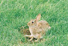 Predators that take nestlings include raccoon, badger (Taxidea taxus), skunks (Mephitis and Spilogale spp.), and Virginia opossum (Didelphis virginiana).[21] In central Missouri, eastern cottontails comprised the majority of biomass in the diet of red-tailed hawks (Buteo jamaicensis) during the nesting season. In Pennsylvania, the chief predator of eastern cottontails is the great horned owl.[21] In the Southwest cottontails including eastern cottontail comprise 7 to 25% of the diets of northern goshawk (Accipiter gentilis). In Texas, eastern cottontails are preyed on by coyotes more heavily in early spring and in fall than in summer or winter. In southwestern North Dakota, cottontails (both eastern and desert cottontail Sylvilagus auduboni) were major prey items in the diets of bobcats.[24]