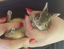 The nest is a slanting hole dug in soft soil and lined with vegetation and white fur from the mother's underside. The average measurements are: length 7.09 in (18 cm), width 4.9 in (12 cm), and depth 4.71 in (12 cm).[9] The average period of gestation is 28 days, ranging from 25 to 35 days.[11] Eastern cottontail young are born with a very fine coat of hair and are blind. Their eyes begin to open by four to seven days. Young begin to move out of the nest for short trips by 12 to 16 days and are completely weaned and independent by four to five weeks.[9][20] Litters disperse at about seven weeks. Females do not stay in the nest with the young but return to the opening of the nest to nurse, usually twice a day.[11][20]