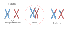 Synapsis (also called syndesis) is the pairing of two chromosomes that occurs during meiosis. It allows matching-up of homologous pairs prior to their segregation, and possible chromosomal crossover between them. Synapsis takes place during prophase I of meiosis. When homologous chromosomes synapse, their ends are first attached to the nuclear envelope. These end-membrane complexes then migrate, assisted by the extranuclear cytoskeleton, until matching ends have been paired. Then the intervening regions of the chromosome are brought together, and may be connected by a protein-RNA complex called the synaptonemal complex.[1] Autosomes undergo synapsis during meiosis, and are held together by a protein complex along the whole length of the chromosomes called the synaptonemal complex. Sex chromosomes also undergo synapsis; however, the synaptonemal protein complex that holds the homologous chromosomes together is only present at one end of each sex chromosome. [2]