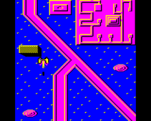 The game vertically scrolls, with the player being able to change direction at any time, but not change speed. The landscape loops with the player being able to reach the bottom by travelling up far enough, and vice versa. The game is incredibly fast and smooth scrolling (particularly for the Acorn Electron which lacks hardware scrolling ability), and the author once stated that he designed Syncron as an exercise in pure speed rather than playability.[4] The levels feature tall buildings that need to be avoided. As the scrolling is so fast, the player must learn the layout of the level to avoid these hazards.