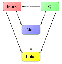 Three‑source (Mark‑Q/Matthew) | ![]() | A hybrid of Two-source and Farrer. Q may be limited to sayings, may be in Aramaic, and may also be a source for Mark. | |