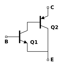 In electronics, the Sziklai Pair, also known as a complementary feedback pair, is a configuration of two bipolar transistors, similar to a Darlington pair.[1] In contrast to the Darlington arrangement, the Sziklai Pair has one NPN and one PNP transistor, and so it is sometimes also called the "complementary Darlington". The configuration is named for its inventor, George C. Sziklai (US patents 2,792,870 and 2,791,644).
