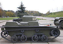 Like other light tanks of its time, the T-38 was designed for reconnaissance and infantry support roles. As a scout tank the T-38 had the advantages of a very low silhouette and good long-range mobility through its ability to swim. The T-38 was also intended to be air-portable; during the Kiev maneuvers in 1936, the tanks were transported by Tupolev TB-3 bombers, mounted under the fuselage.[3] Infantry battalions were each issued 38 T-38s, with 50 being designated for each airborne armored battalions. However, the thin armor and single machinegun armament made the tank of only limited use in combat and the lack of a radio in most T-38s was a serious limitation for a reconnaissance vehicle. The T-38 also struggled with carrying any excess cargo across water. The tank was incapable of supporting the weight of two infantrymen while floating, and overloads of 120-150 kilos would cause the commander's hatch to flood, sinking the vehicle.[1] These flaws were to be fixed by the T-38's successor, the T-40, but only a small number were built before the outbreak of World War II, leaving the T-37A and T-38 to form the bulk of the Red Army's amphibious tanks.[4]