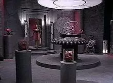 The TARDIS has at least two console rooms: the primary one most used throughout the programme's history, and the secondary console room used during Season 14 in 1976/77, which has wood panelling and a more antique feel.[54] It had been designed to make shooting more comfortable for the camera crew. Putting the console on a dais meant the cameramen no longer had to crouch for eye-level shots. However the set walls warped after it was put into storage at the end of production, and it had to be discarded.