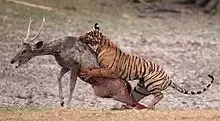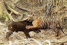 When hunting larger animals, tigers prefer to bite the throat and use their powerful forelimbs to hold onto the prey, often simultaneously wrestling it to the ground. The tiger remains latched onto the neck until its target dies of strangulation.[89] By this method, gaurs and water buffaloes weighing over a ton have been killed by tigers weighing about a sixth as much.[102] Although they can kill healthy adults, tigers often select the calves or infirm of very large species.[103] Healthy adult prey of this type can be dangerous to tackle, as long, strong horns, legs and tusks are all potentially fatal to the tiger. No other extant land predator routinely takes on prey this large on its own.[18][104]