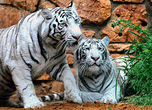 The white tiger lacks pheomelanin (which creates the orange colour), and has dark sepia-brown stripes and blue eyes. This altered pigmentation is caused by a mutant gene that is inherited as an autosomal recessive trait, which is determined by a white locus. It is not an albino, as the black pigments are scarcely affected.[61][59] The mutation changes a single amino acid in the transporter protein SLC45A2. Both parents need to have the allele for whiteness to have white cubs.[62] Between the early and mid 20th century, white tigers were recorded and shot in the Indian states of Odisha, Bihar, Assam and in the area of Rewa, Madhya Pradesh. The local maharaja started breeding tigers in the early 1950s and kept a white male tiger together with its normal-coloured daughter; they had white cubs.[63] To preserve this recessive trait, only a few white individuals were used in captive breeding, which led to a high degree of inbreeding. Inbreeding depression is the main reason for many health problems of captive white tigers, including strabismus, stillbirth, deformities and premature death.[64] Other physical defects include cleft palate and scoliosis.[65]