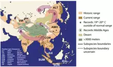 The tiger historically ranged from eastern Turkey and Transcaucasia to the coast of the Sea of Japan, and from South Asia across Southeast Asia to the Indonesian islands of Sumatra, Java and Bali.[50] Since the end of the last glacial period, it was probably restricted by periods of deep snow lasting longer than six months.[67][68] Currently, it occurs in less than 6% of its historical range, as it has been extirpated from Southwest and Central Asia, large parts of Southeast and East Asia. It now mainly occurs in the Indian subcontinent, the Indochinese Peninsula, Sumatra and the Russian Far East. In China and Myanmar, breeding populations appear to rely on immigration from neighbouring countries while its status in the Korean Peninsula is unknown.[1][69]