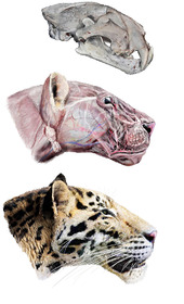 The tiger's skull is similar to a lion's skull, with the frontal region usually less depressed or flattened, and a slightly longer postorbital region. The lion skull shows broader nasal openings. Due to the variation in skull sizes of the two species, the structure of the lower jaw is a reliable indicator for their identification.[18] The tiger has fairly stout teeth; its somewhat curved canines are the longest among living felids with a crown height of up to 90 mm (3.5 in).[22]