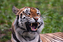 Facial expressions include the "defense threat", where an individual bares its teeth, flattens its ears and its pupils enlarge. Both males and females show a flehmen response, a characteristic grimace, when sniffing urine markings, but flehmen is more often associated with males detecting the markings made by tigresses in oestrus. Like other Panthera, tigers roar, particularly in aggressive situations, during the mating season or when making a kill. There are two different roars: the "true" roar is made using the hyoid apparatus and forced through an open mouth as it progressively closes, and the shorter, harsher "coughing" roar is made with the mouth open and teeth exposed. The "true" roar can be heard at up to 3 km (1.9 mi) away and is sometimes emitted three or four times in succession. When tense, tigers will moan, a sound similar to a roar but more subdued and made when the mouth is partially or completely closed. Moaning can be heard 400 m (1,300 ft) away.[22] Chuffing—soft, low-frequency snorting similar to purring in smaller cats—is heard in more friendly situations.[93] Other vocal communications include grunts, woofs, snarls, miaows, hisses and growls.[22]