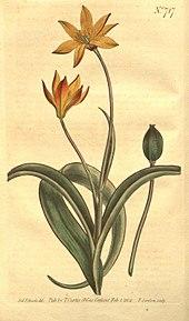 27. ^ Sims, John, ed. (1804). "Tulipa Breyntiana. Cape Tulip". Curtis's Botanical Magazine. Vol. 19. Drawn by Sydenham Edwards; Engraved by F. Sansom. T. Curtis. plate 717.