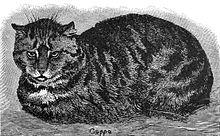 Since the tabby pattern is a common wild type, it might be assumed that medieval cats were tabbies. However, one writer believed this to be untrue, at least in England. Sometime after the mid-17th century, the natural philosopher John Aubrey noted that William Laud, the Archbishop of Canterbury was "a great lover of Cats" and "was presented with some Cyprus-cats, i.e. our Tabby-Cats". He then claimed that "I doe [sic] well remember that the common English Catt, was white with some blueish piednesse (i.e. white with grey parts). The race or breed of them is now almost lost."[12] However, most drawings or paintings of cats in medieval manuscripts do show them to be tabbies.[13]