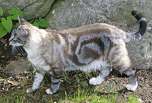 A tabby is any domestic cat (Felis catus) with a distinctive 'M' shaped marking on its forehead, stripes by its eyes and across its cheeks, along its back, and around its legs and tail, and (differing by tabby type), characteristic striped, dotted, lined, flecked, banded or swirled patterns on the body—neck, shoulders, sides, flanks, chest and abdomen. "Tabby" is not a breed of cat but a coat type seen in almost all genetic lines of domestic cats, regardless of status.[1] The tabby pattern is found in many official cat breeds and is a hallmark of the landrace extremely common among the general population of cats around the world. The tabby pattern occurs naturally and is connected both to the coat of the domestic cat's direct ancestor and to those of their close relatives: the African wildcat (Felis lybica lybica), the European wildcat (Felis silvestris silvestris) and the Asiatic wildcat (Felis lybica ornata), all of which have similar coats, both by pattern and coloration. A genetic study of tabbies found five genetic clusters to be ancestral to cats of various parts of the world.[2]