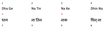 - ^ Courtney, Todd A. Dombrowski, David. "Basic Technique of Tabla bols: Dhaa, Dhin, Ga, Ka, Naa, Na, Taa, Tak,TiRaKiTa, Tin, Tu, etc". chandrakantha.com.