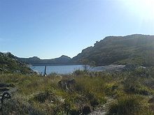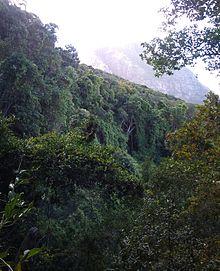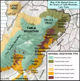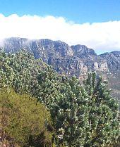 Remnant patches of indigenous forest persist in the wetter ravines. However, much of the indigenous forest was felled by the early European settlers for fuel for the lime kilns needed during the construction of the Castle.[17] The exact extent of the original forests is unknown, though most of it was probably along the eastern slopes of Devil's Peak, Table Mountain and the Back Table where names such as Rondebosch, Kirstenbosch, Klassenbosch and Witteboomen survive (in Dutch "bosch" means forest; and "boomen" means trees). Hout Bay (in Dutch "hout" means wood) was another source of timber and fuel as the name suggests.[17] In the early 1900s commercial pine plantations were planted on these slopes all the way from the Constantiaberg to the front of Devil's Peak, and even on top of the mountains, but these have now been largely cleared allowing fynbos to flourish in the regions where the indigenous Afromontane forests have not survived, or never existed.