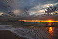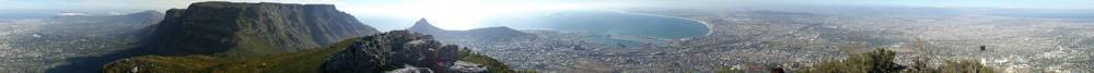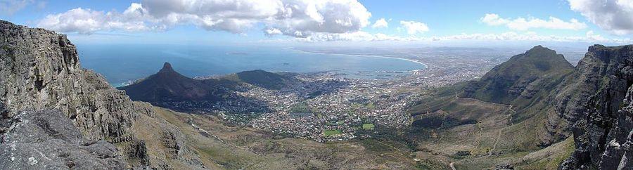 View of Table Mountain and Cape Town seen from Bloubergstrand. Table Mountain is flanked by Devil's Peak on the left and Lion's Head on the right. | |
