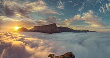 Table Mountain (Khoekhoe: Huriǂoaxa, lit. 'sea-emerging'; Afrikaans: Tafelberg) is a flat-topped mountain forming a prominent landmark overlooking the city of Cape Town in South Africa. It is a significant tourist attraction, with many visitors using the cableway or hiking to the top.[2] The mountain forms part of the Table Mountain National Park, and part of the lands formerly ranged by Khoe-speaking clans, such as the !Uriǁʼaes (the "High Clan"). It is home to a large array of mostly endemic fauna and flora.[3]