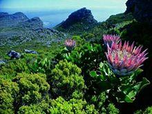 Table Mountain's vegetation types form part of the Cape Floral Region protected areas. These protected areas are a World Heritage Site, and an estimated 2,285 species of plants are confined to Table Mountain and the Cape Peninsula range, of which a great proportion, including many species of proteas, are endemic to these mountains and valleys and can be found nowhere else.[14][15] Of the 2,285 species on the Peninsula 1,500 occur in the 57 km2 area comprising Table Mountain and the Back Table, a number at least a large as all the plant species in the whole of the United Kingdom.[14] The Disa uniflora, despite its restricted range within the Western Cape, is relatively common in the perennially wet areas (waterfalls, streamlets and seeps) on Table Mountain and the Back Table, but hardly anywhere else on the Cape Peninsula.[13][16] It is a very showy orchid that blooms from January to March on the Table Mountain Sandstone regions of the mountain. Although they are quite widespread on the Back Table, the best (most certain, and close-up) place to view these beautiful blooms is in the "Aqueduct" off the Smuts Track, halfway between Skeleton Gorge and Maclear's Beacon.