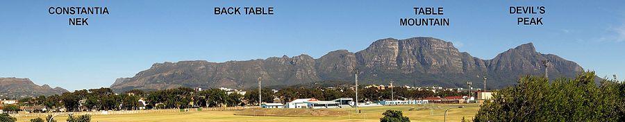 Table Mountain is at the northern end of a sandstone mountain range that forms the spine of the Cape Peninsula that terminates approximately 50 kilometres (30 mi) to the south at the Cape of Good Hope and Cape Point. Immediately to the south of Table Mountain is a rugged "plateau" at a somewhat lower elevation than the Table Mountain Plateau (at about 1,000 m or 3,300 ft), called the "Back Table". The "Back Table" extends southwards for approximately 6 km to the Constantia Nek-Hout Bay valley. The Atlantic side of the Back Table is known as the Twelve Apostles, which extends from Kloof Nek (the saddle between Table Mountain and Lion's Head) to Hout Bay. The eastern side of this portion of the Peninsula's mountain chain, extending from Devil's Peak, the eastern side of Table Mountain (Erica and Fernwood Buttresses), and the Back Table to Constantia Nek, does not have single name, as on the western side. It is better known by the names of the conservation areas on its lower slopes: Groote Schuur Estate, Newlands Forest, Kirstenbosch Botanical Gardens, Cecilia Park, and Constantia Nek.