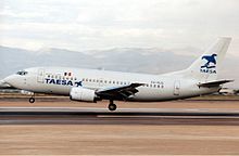 The airline, owned by a business person legally represented by Alberto Abed Schekaiban, was established on April 27, 1988, operating executive business aircraft and later on in 1989 received their first Boeing 727-100 which was used to launch regularly scheduled passenger service. [2] TAESA began growing rapidly using 727s in airline service. In 1991, they received their first Boeing 757-200 and became the first commercial airline in Mexico to operate this aircraft type. Also in 1991, several Boeing 737-300s were added with additional 757s and a sole Boeing 767-300 being added as well to a fleet of Boeing 737-200/300/400/500 jetliners. TAESA was at that time the first Boeing 737-500 operator in Latin America.During the first half of the 1990s, TAESA was quite successful flying cargo for DHL and Serpaprosa with their Boeing 727-100Cs. Also during this time, several 737s were leased to Garuda Indonesia to make Asian flights. Meanwhile, they won charter contracts from companies such as Apple Vacations. By 1992, the airline was operating many charter flights to cities in Canada, Europe and the USA.[3] In the domestic market, TAESA started a fare war with the main carriers, Aeroméxico and Mexicana.[4]